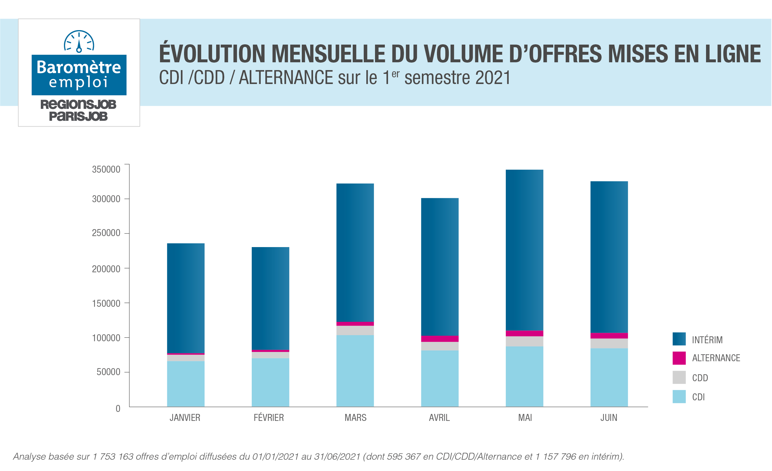 HelloWork, le premier acteur digital français de l’emploi, du recrutement et de la formation (qui édite les plateformes RegionsJob, ParisJob, Cadreo,..) a diffusé plus de 1 753 000 offres d’emploi au 1er semestre 2021. Ses 5 millions de Visiteurs Uniques* chaque mois lui permettent de proposer un panorama complet des dynamiques de l’emploi en France.