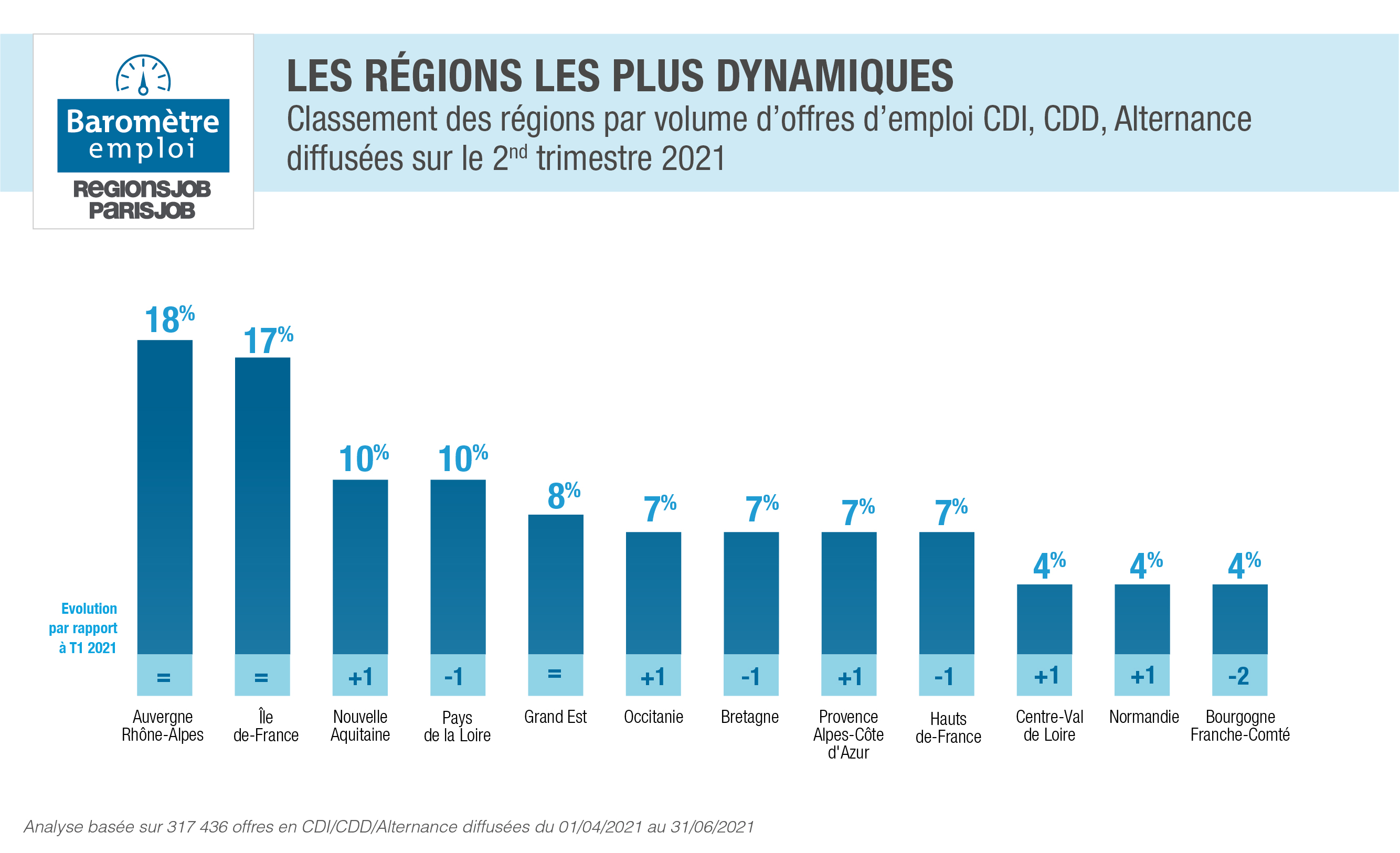 L’emploi conserve la dynamique du premier trimestre 2021. L’Auvergne-Rhône-Alpes reste ainsi à la 1ère place du classement des régions qui recrutent le plus en CDI et CDD au second trimestre et représente 18% des 317 436 offres publiées. Après un premier trimestre en décroissance, l’Île-de-France n’en demeure pas moins l’une des régions proposant le plus d’offres d’emploi CDI/CDD et se positionne à la seconde place, avec 17% du volume national.