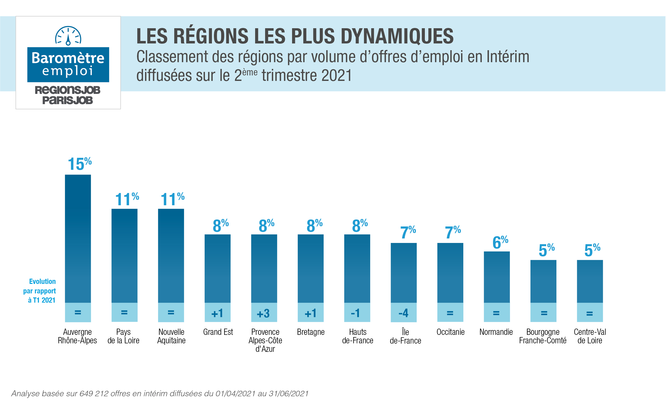 Sur les 649 212 offres en intérim analysées, l’Auvergne-Rhône-Alpes occupe également la 1ère place du classement des régions qui recrutent le plus en intérim (15%). Les Pays de la Loire et la Nouvelle Aquitaine prennent respectivement la 2ème et 3ème place avec 11% du volume national. La Bourgogne-Franche-Comté et le Centre-Val de Loire sont celles qui proposent le moins d’offres de travail temporaire (5%). La 8ème place de l’Île-de-France traduit quant à elle l’impact des contraintes sanitaires et des fermetures d’établissements qui ont fortement pesées sur la région francilienne notamment sur les secteurs du tourisme et de la culture.