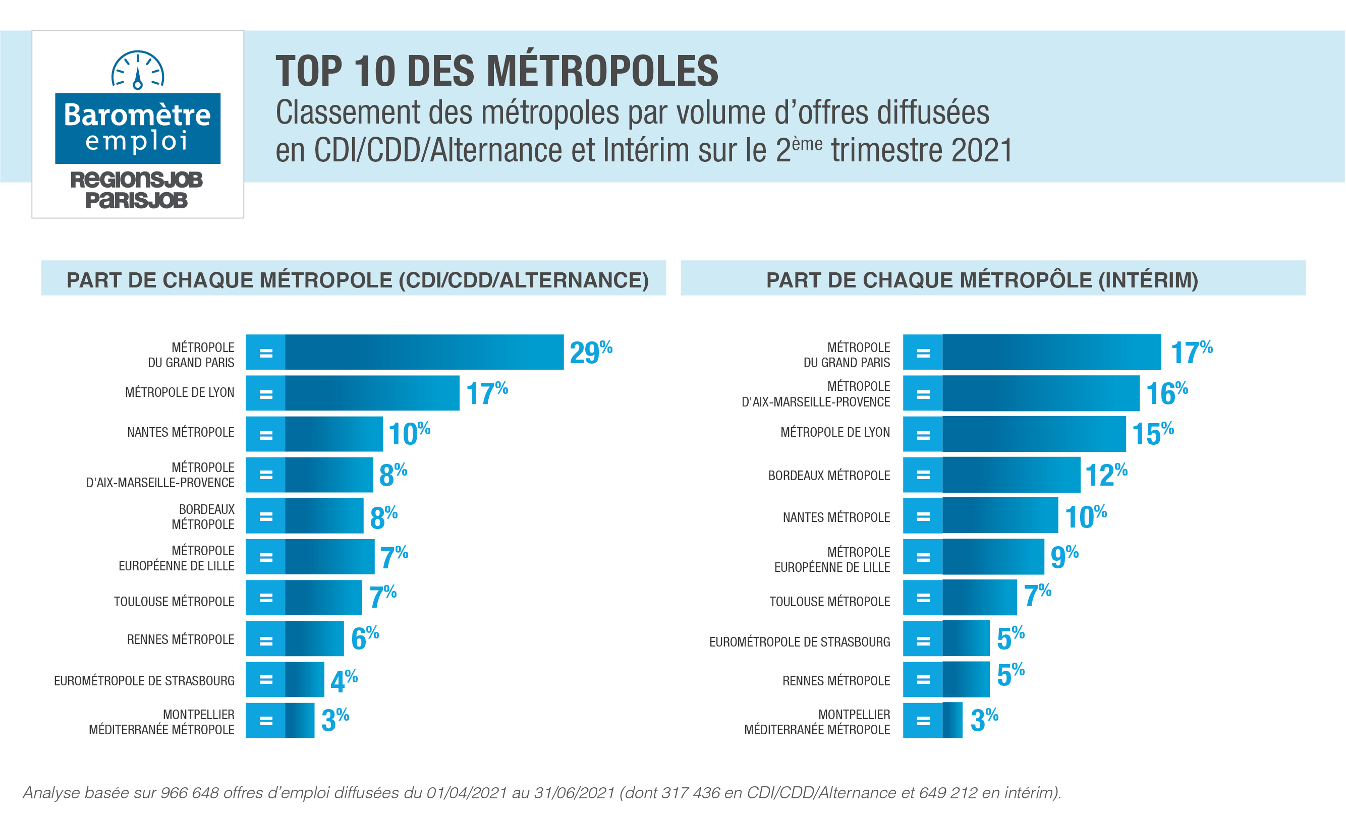 Les Métropoles d’Aix-Marseille et Bordeaux Métropole occupent ensuite respectivement la 4ème et 5ème place. Montpellier Méditerranée Métropole ne pèse que pour 3% des offres en CDI /CDD et intérim à pourvoir en France.