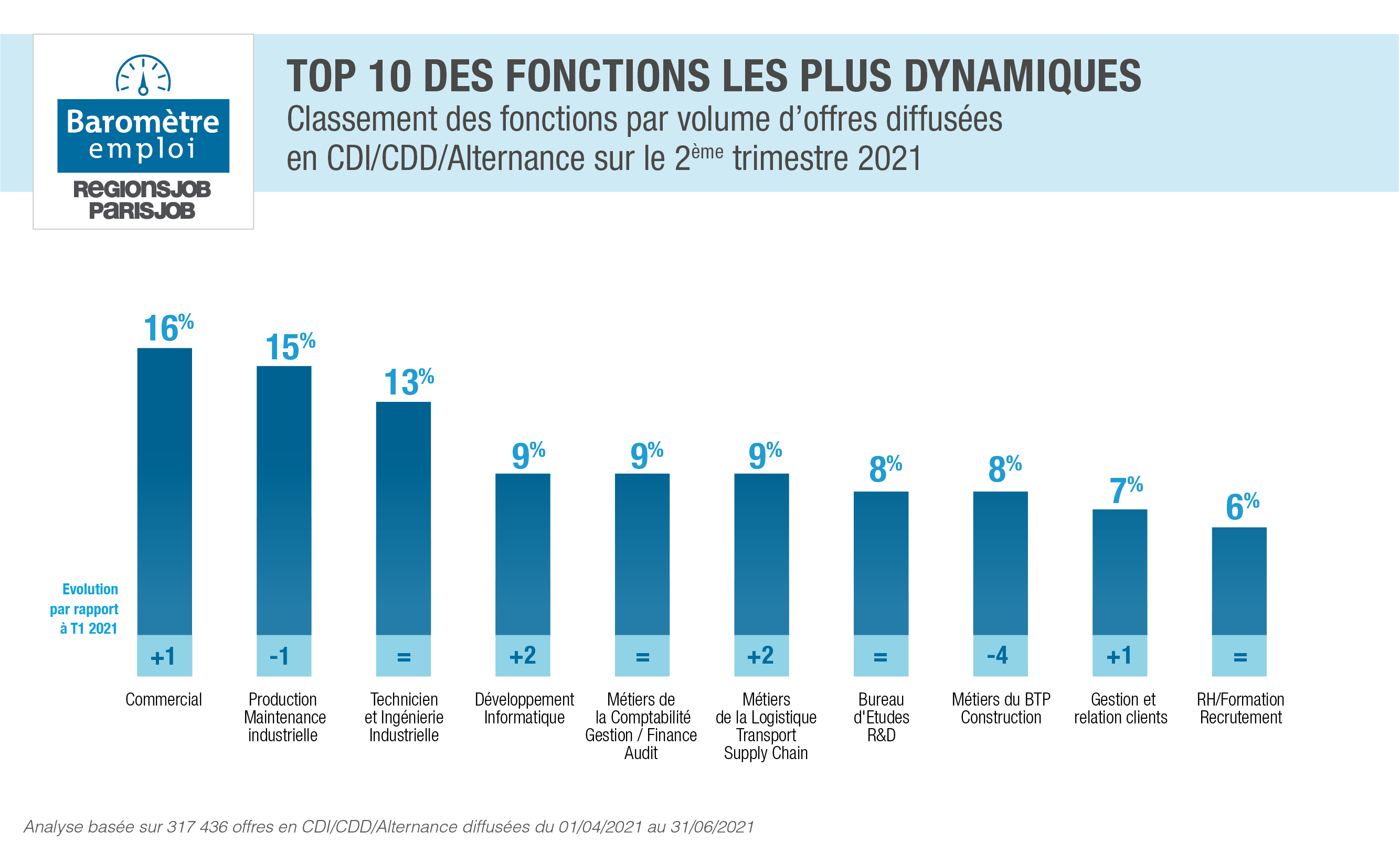 Le classement des postes les plus dynamiques est composé des fonctions commerciales (16% du volume des offres mises en ligne en CDI/CDD et a pris une place par rapport au 1er trimestre 2021), suivies des métiers de la Production et de la Maintenance industrielle (15%) et des techniciens en ingénierie industrielle (13%). Ces trois métiers représentent à eux seuls près de la moitié (44%) des offres en CDI/CDD à pourvoir.
