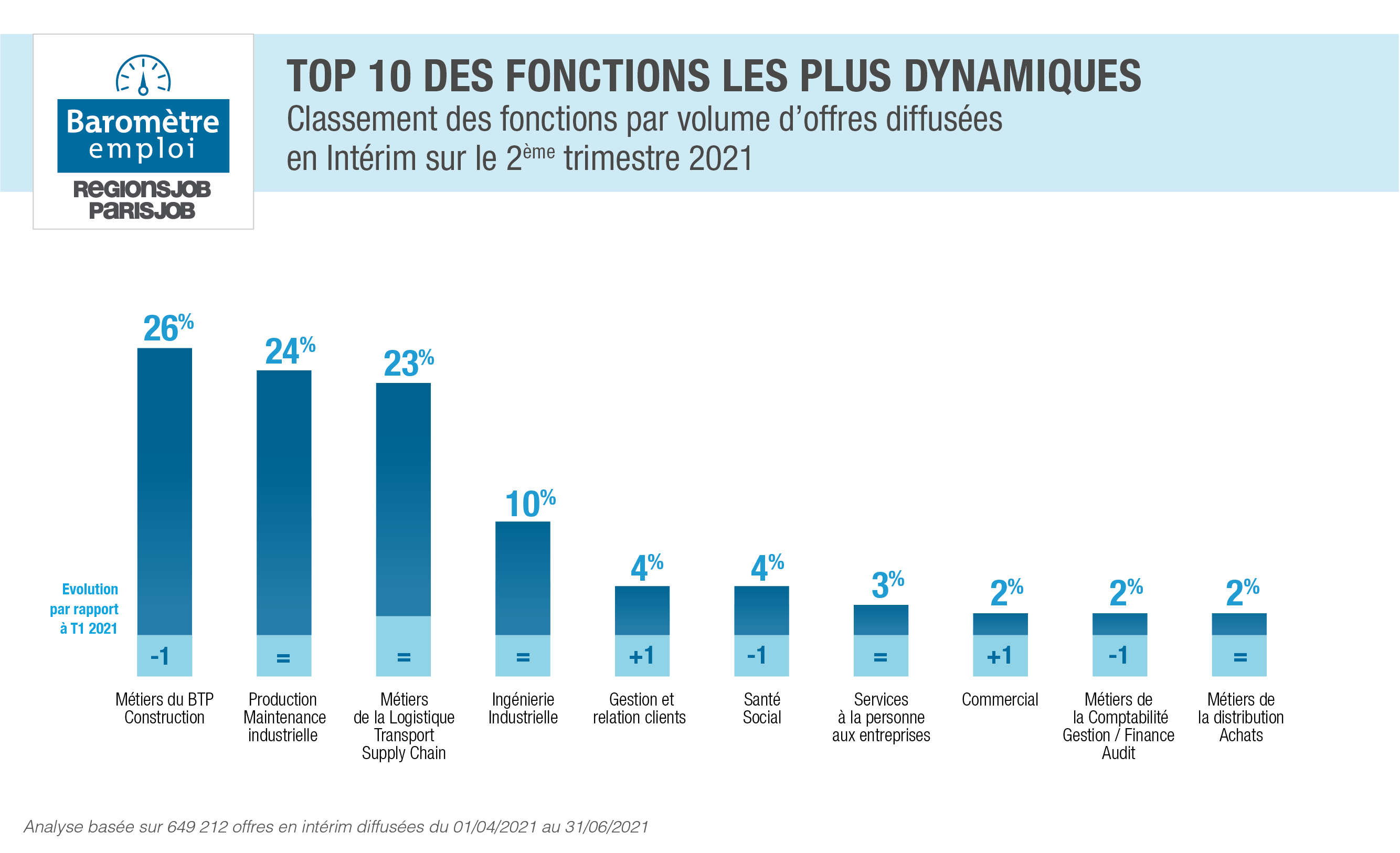 A noter, les métiers de la logistique et du Transport et les postes en développement informatique montent de 2 places dans le classement au second trimestre. En revanche, ceux du BTP et de la construction en perdent 4.