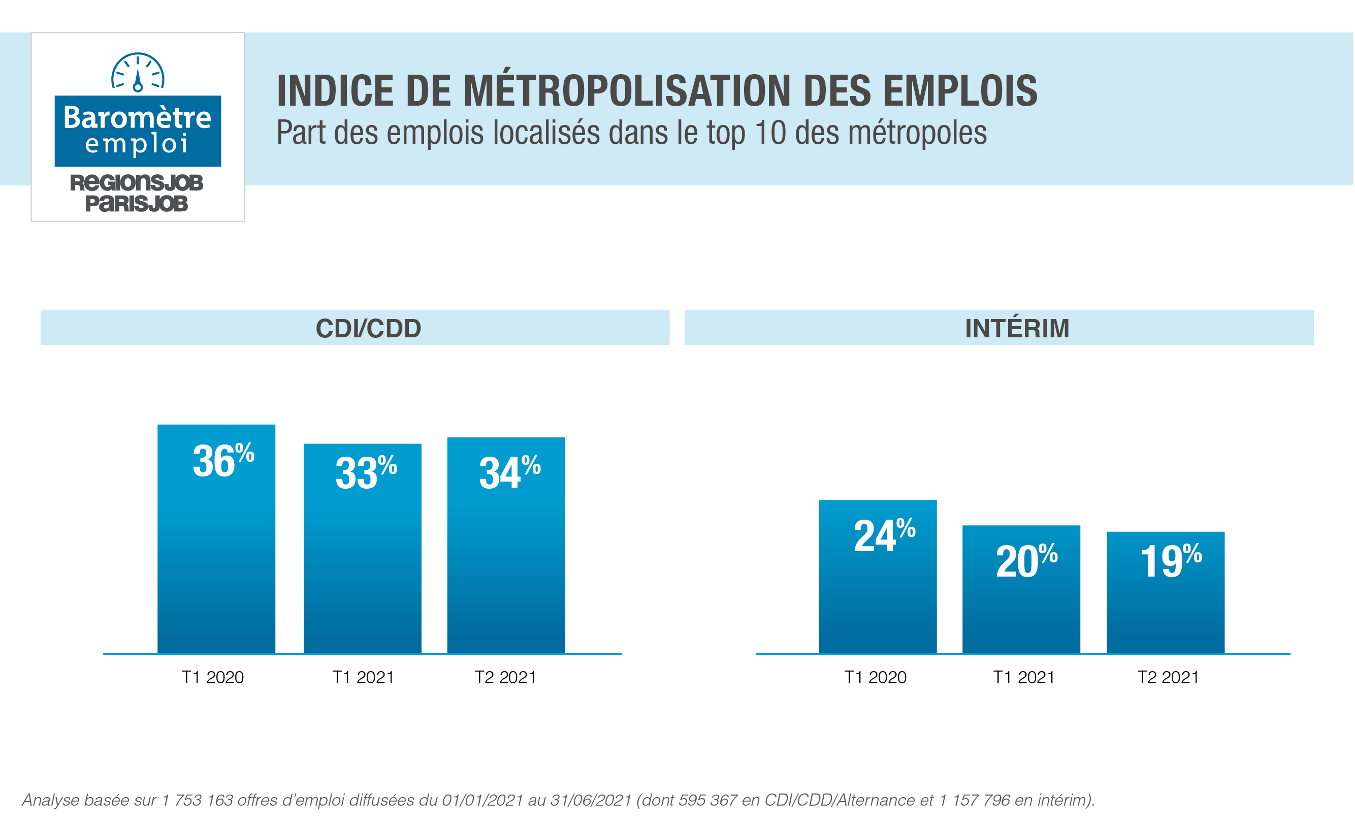 Les 10 plus grandes métropoles concentrent 34% des offres en CDI/CDD au 2ème trimestre 2021, contre 36% en 2020. Depuis six mois, nous observons une baisse de l’influence des métropoles sur les emplois au profit des ville moyennes (Cholet, Angers, Vannes…). De la même façon, le top 10 des métropoles concentraient 24% des offres en intérim en 2020 et n’en concentrent plus que 19% au 2ème trimestre 2021.