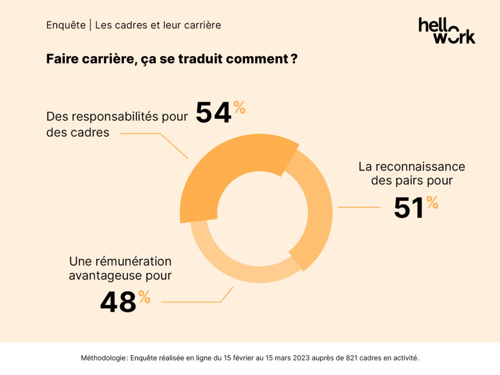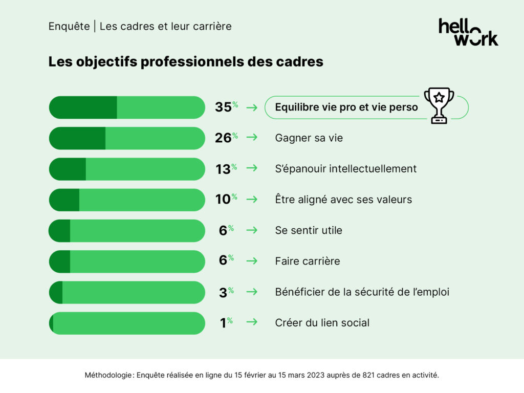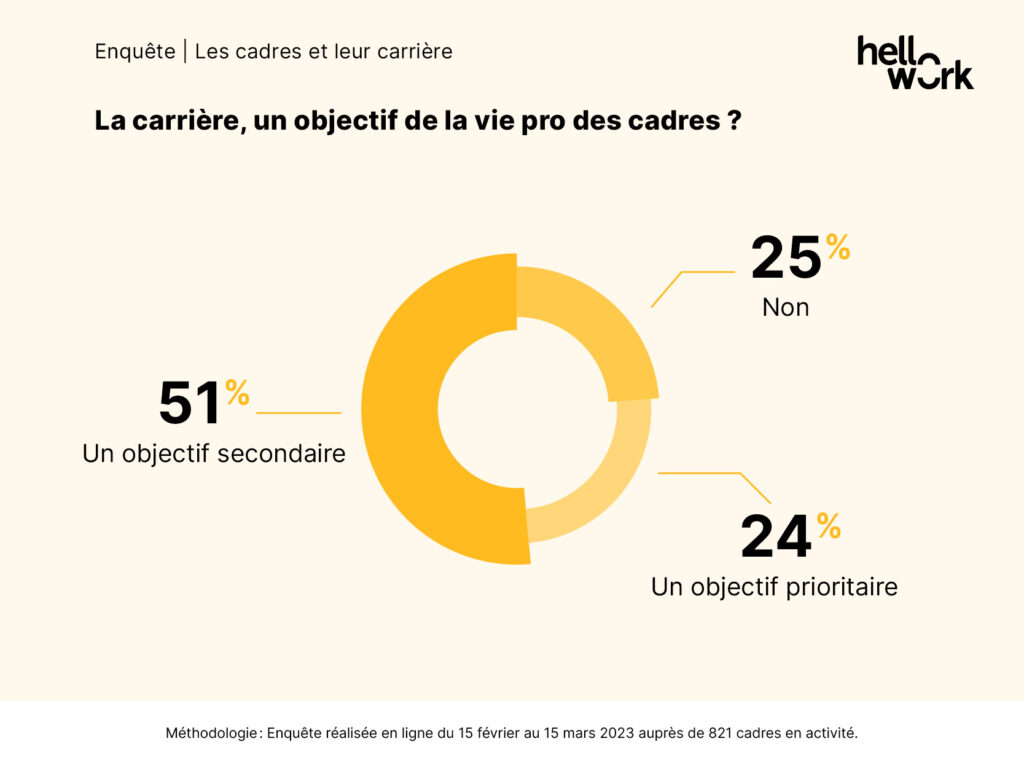 Qu’attendent-ils réellement de leur quotidien au travail ? « Faire carrière » a-t-il toujours la même importance pour eux ? Pour le savoir, la plateforme de recrutement hellowork.com a mené l’enquête en interrogeant 821 cadres en activité du 15 février au 15 mars 2023.