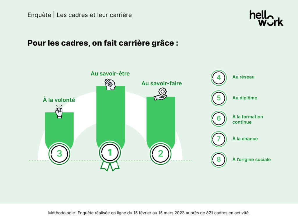 Pour évoluer dans leur carrière, les cadres pensent qu’il faut d’abord des qualités humaines plutôt que des compétences professionnelles. 26% déclarent que le savoir-être est l’atout principal quand on veut gravir les échelons. Le savoir-faire et la volonté sont les deux autres facteurs principaux d’une ascension professionnelle selon eux. A l’inverse, ils estiment que la chance ou l’origine sociale ont peu d’influence sur leur réussite.