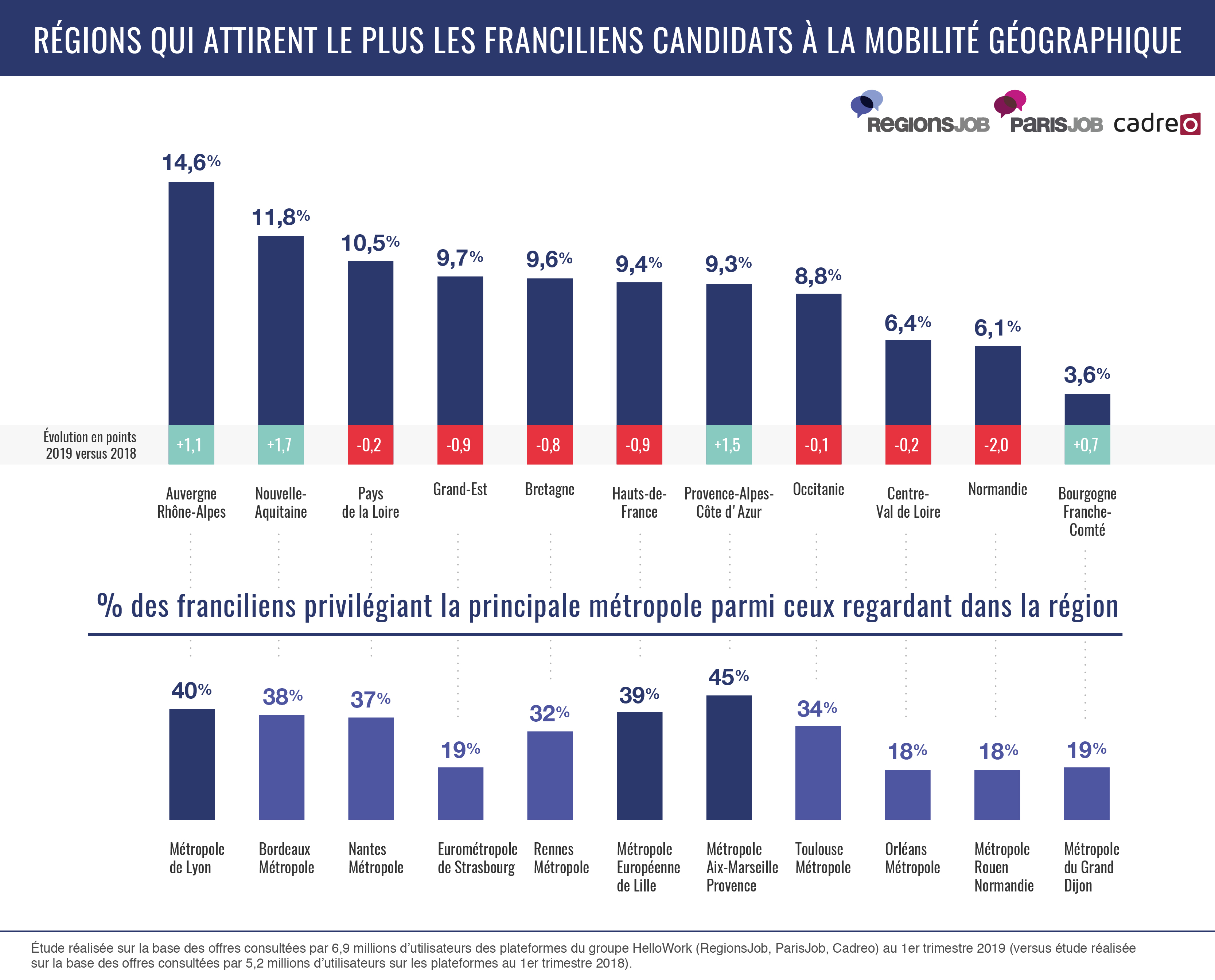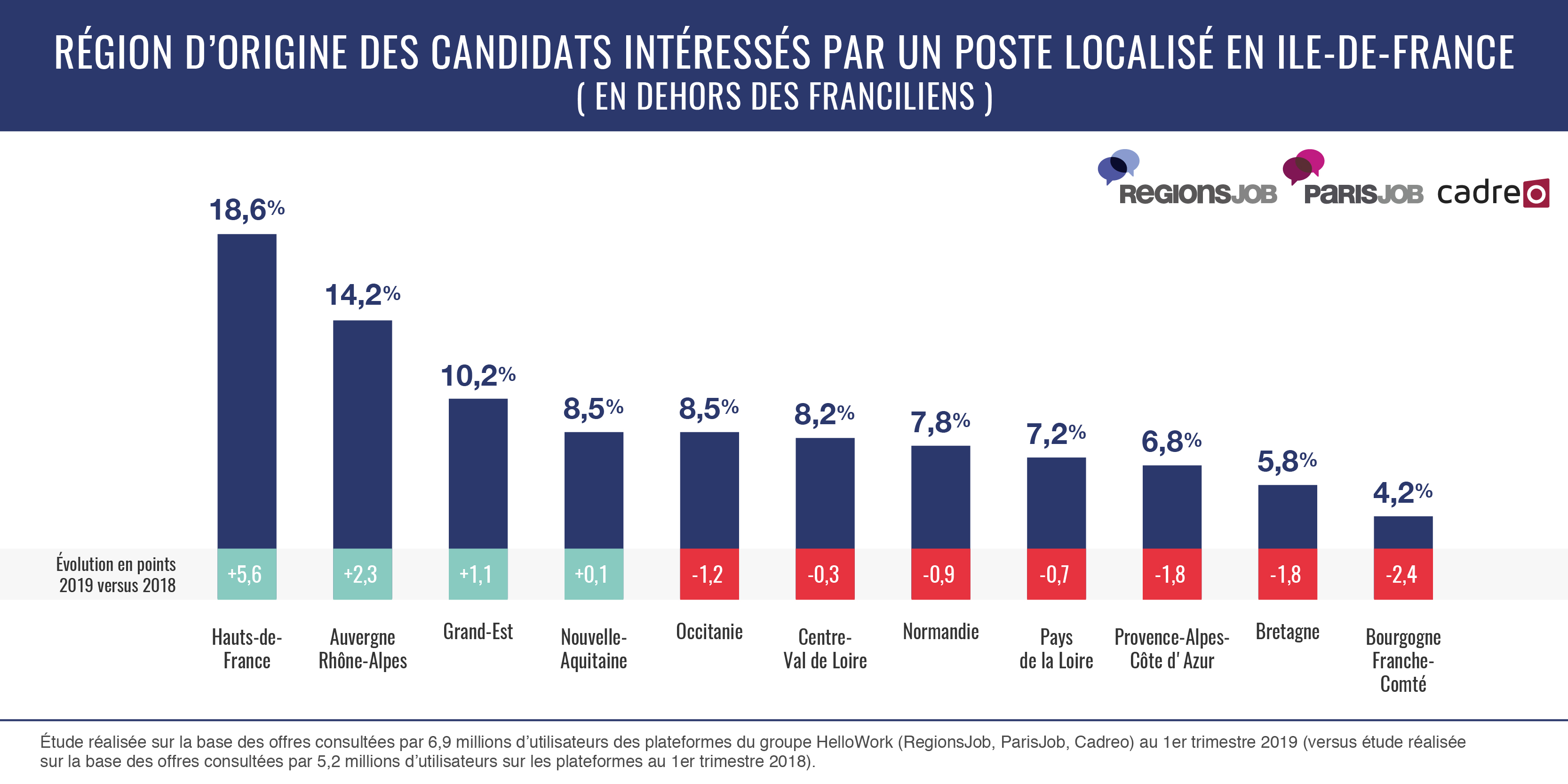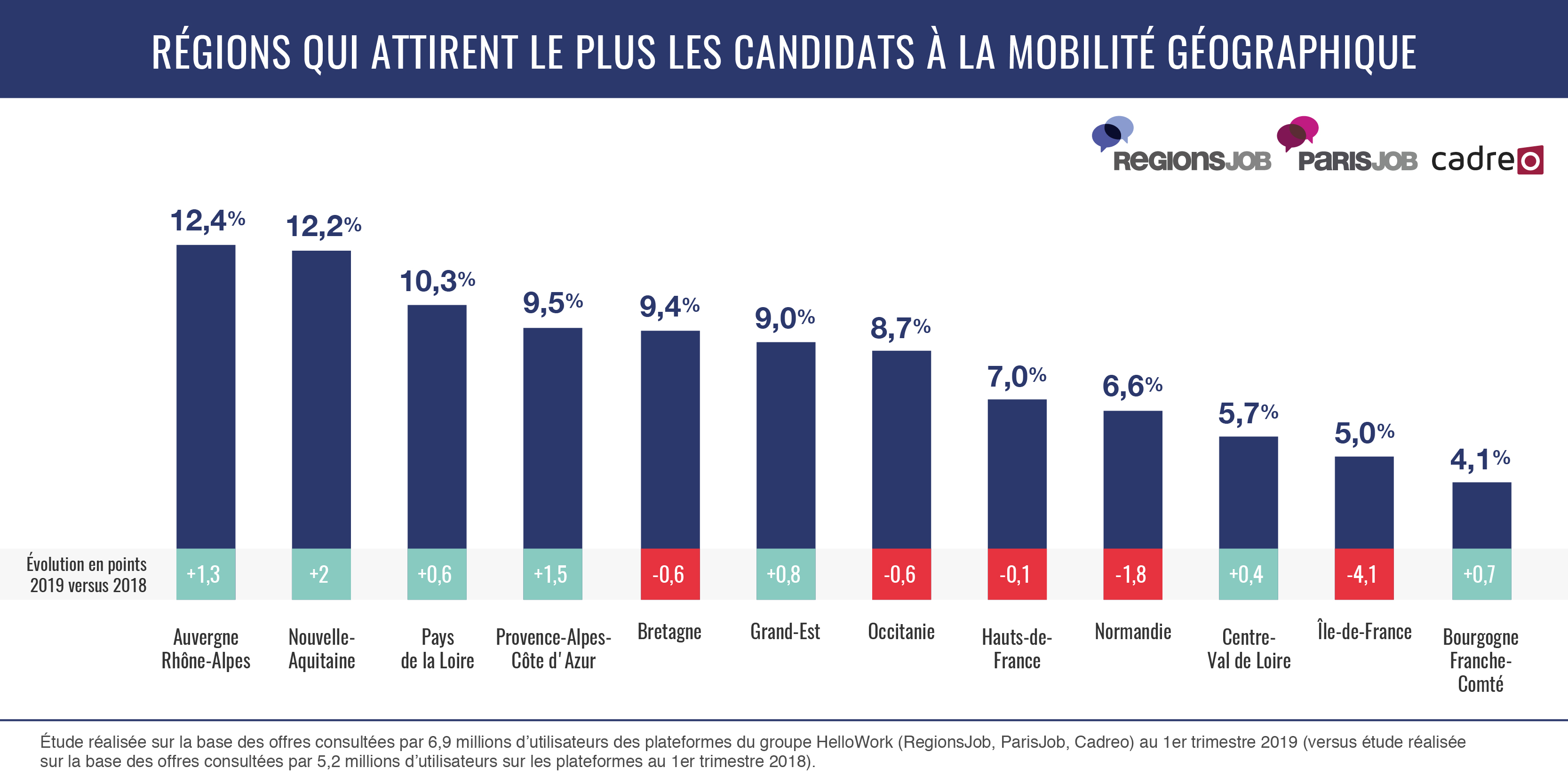 HelloWork, l’acteur digital de référence de l’emploi, du recrutement et de la formation en France, a analysé l’utilisation de ses plateformes RegionsJob, ParisJob et Cadreo au cours du 1er trimestre 2019. Grâce à l’étude des recherches effectuées par 6,9 millions d’utilisateurs, HelloWork vous dit tout des envies de mobilité professionnelle interrégionale en France au 1e trimestre 2019 :
