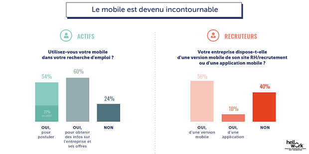 En 2017, 22% des actifs déclaraient utiliser leur mobile pour postuler à des offres d’emploi. L’usage s’intensifie fortement en 2018 avec +32 points : ils sont 54% à candidater depuis leur smartphone. Les recruteurs sont 56% à disposer d’une version mobile de leur site RH/recrutement (+7 points versus 2017) et 10% d’une application mobile (-9 points versus 2017).