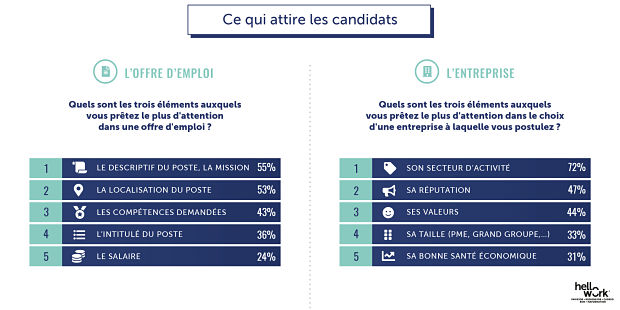 Sur l’offre, c’est assez naturellement le descriptif du poste et de la mission qui compte le plus (55%), suivi de près par la localisation du poste (53%) et les compétences demandées (43%). Le salaire arrive à la 5ème place avec 24% des candidats qui le citent dans les trois éléments auxquels ils prêtent le plus d’attention. Sur l’entreprise en elle-même, c’est le secteur d’activité qui arrive en tête (72% des actifs le cite comme l’un des trois éléments qui retiennent le plus son attention), sa réputation arrive après avec 47%, puis ses valeurs avec 44%. La bonne santé économique de l’entreprise arrive en 5ème position (31%).