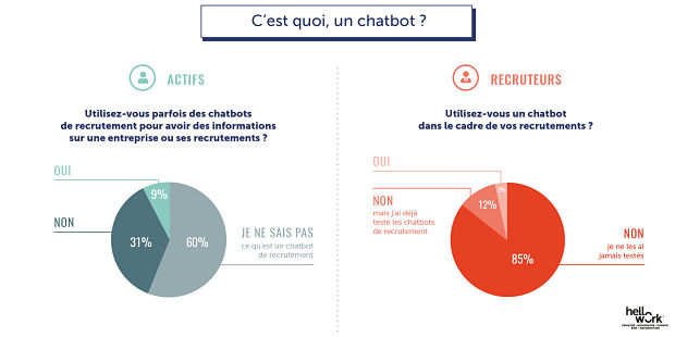 De nouveaux usages font timidement leur apparition. Si les chatbots sont devenus une norme pour les sites e-commerce, ils s’imposent plus difficilement dans le processus de recrutement. Les actifs sont 60% à ne pas savoir de quoi il s’agit, 9% seulement les utilisant. Ce n’est pas mieux côté recruteurs avec 3% d’interrogés qui ont déjà testé ce concept.