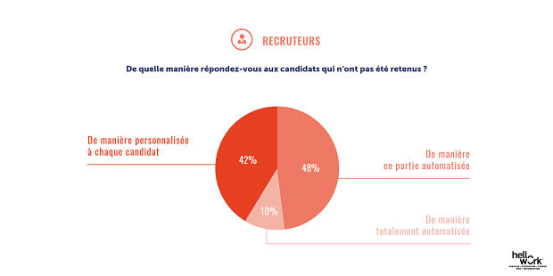 Les candidats sont 62% à estimer que les recruteurs répondent rarement ou jamais à leurs candidatures lorsqu’ils ne sont pas retenus. Côté recruteurs la perception est toute autre : ils ne sont que 13% à déclarer répondre rarement ou jamais. L’explication se trouve certainement dans les moyens de réponse : les recruteurs précisent effectivement répondre de manière totalement ou en partie automatisée pour 48% d’entre eux. Ce type de réponse parait donc peu efficace, perçue comme inexistante par les candidats !