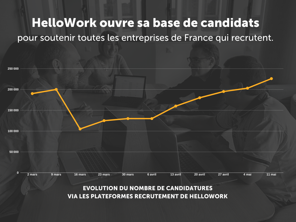Les premiers jours de déconfinement marquent le grand retour des candidats et nous donnent de bonnes raisons d’y croire. Le volume de candidatures hebdomadaire est déjà supérieur à celui des semaines précédant le confinement. Et nous allons atteindre près d’1 million de candidatures au cours du mois de mai via l’ensemble des plateformes HelloWork (RegionsJob, ParisJob, Cadreo).