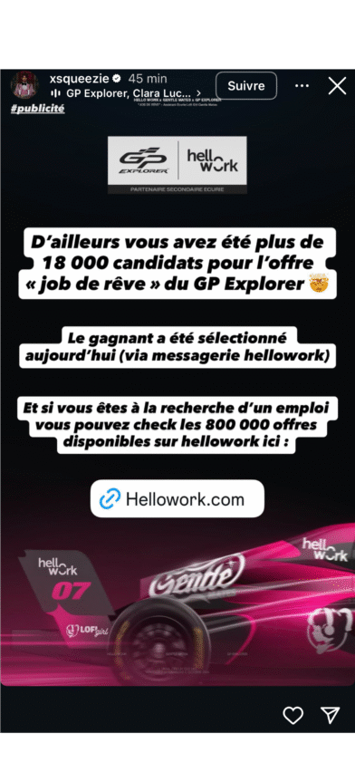 Hellowork ne s’est pas arrêté à l’opération “job de rêve” : la marque a suivi Gentle Mates au-delà des circuits d’esport, jusque sur la grille du GP Explorer.