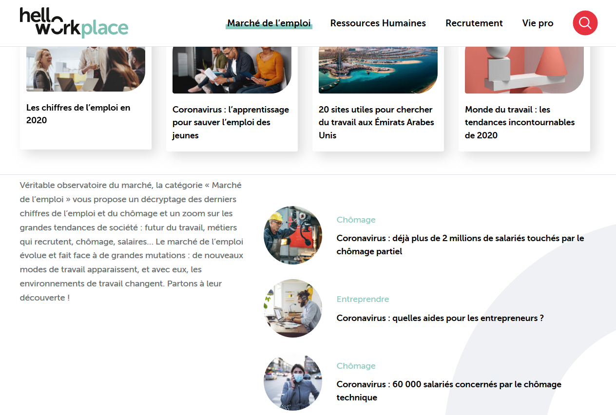 A travers ses rubriques, HelloWorkplace traite de l’actualité du marché de l’emploi et de la gestion de carrière : chiffres de l’emploi, vie de bureau, tendances, nouveaux modes de travail, marque employeur, management, recrutement, formation, télétravail, droit social, handicap, salaires, congés, QVT, etc. En bref, il décrypte le monde du travail en livrant l’essentiel de l’actualité RH.