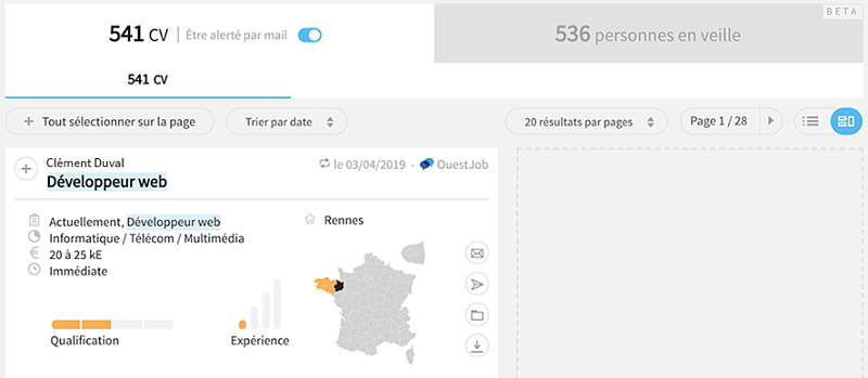 La nouvelle version de la Cvthèque intègre un nouveau système de création d’alertes simplifié. A chaque nouvelle requête, l’utilisateur peut créer une alerte en seul clic directement depuis la page de résultat.