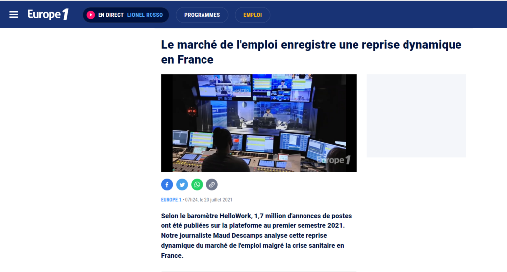2021 ne déroge pas à la règle : chaque trimestre, HelloWork dresse un panorama des dynamiques de l’emploi en s’appuyant sur les données de ses plateformes emploi RegionsJob et ParisJob. Ainsi, en juillet et octobre derniers, des médias comme Le Monde, Europe 1 et Le Parisien ou encore Capital ont repris ces résultats. La presse régionale s’est également fait l’écho du baromètre de l’emploi, dans lequel un focus sur les régions et les métropoles qui recrutent le plus est réalisé : Lyon Plus, le Journal du Grand Paris, le Progrès, Ouest France ou encore le Dauphiné Libéré.