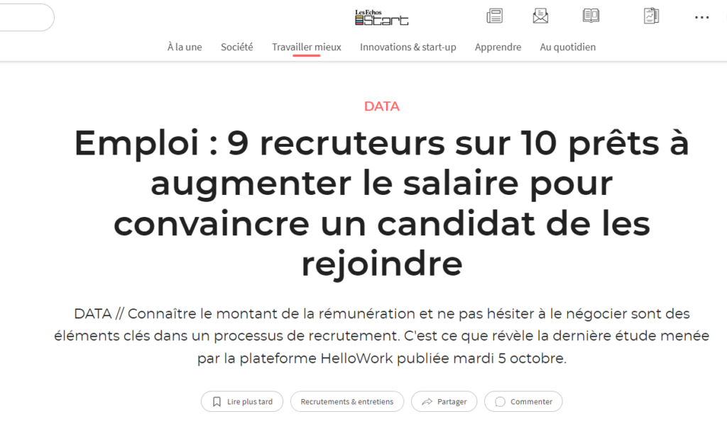 Fin septembre, HelloWork dévoile son étude sur les attentes des candidats et recruteurs, réalisée dans le courant de l’été auprès de 334 professionnels des RH et du recrutement et 1 174 actifs. Diffusée en 3 volets distincts, cette étude met en lumière le télétravail comme critère déterminant dans le choix d’un nouvel employeur – résultats repris par Capital, les rh.fr, info social RH. France Info, Les Echos Start, Rebondir et RTL ont relayé le 2nd volet de l’enquête dédiée aux salaires, tandis que HR voice s’est concentré sur le 3e et dernier volet de l’étude, dédié aux choix de l’entreprise selon sa localisation.